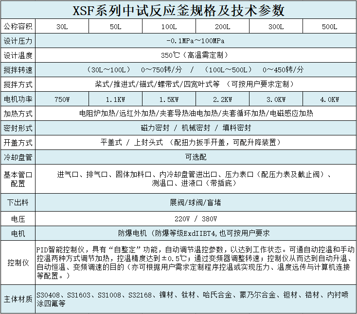 材質一般有碳錳鋼、不銹鋼、鋯、鎳基(哈氏、蒙乃爾、因康鎳)合金等有色金屬及其它復合材料,加熱/降溫方式,可分為電加熱、熱水加熱、導熱油循環加熱、蒸汽加熱、遠紅外加熱、外(內)盤管加熱、電磁感應加熱等,夾套降溫和釜內盤管降溫等。加熱方式的選擇主要跟化學反應所需的加熱/降溫溫度,以及所需熱量大小有關。攪拌器有錨式、框式、槳式、渦輪式,刮板式,組合式等多層復合槳。根據不同工作環境的工藝需要進行設計、制造。